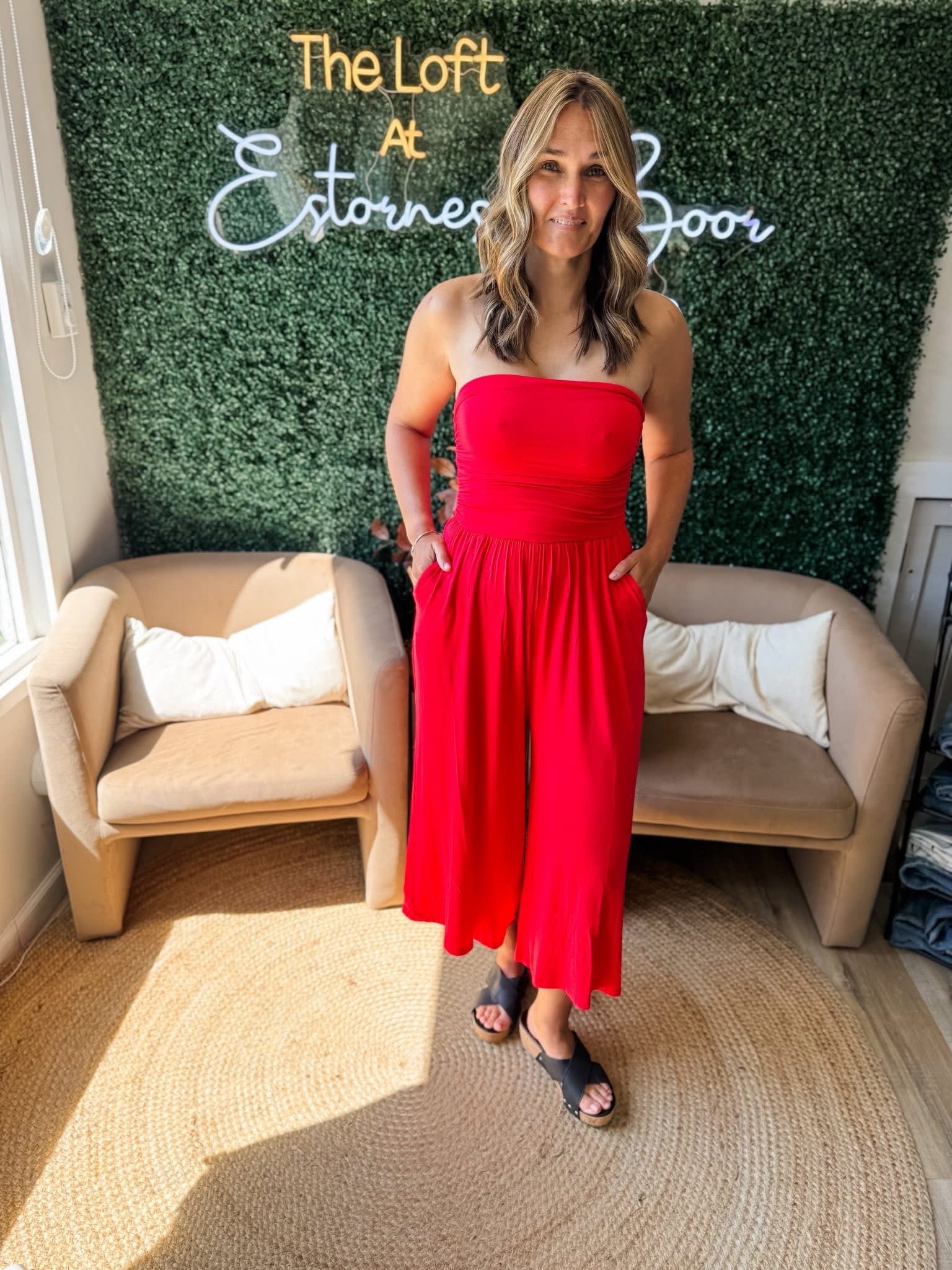 This stunning strapless jumpsuit features a beautifully ruched bodice that creates a flattering silhouette while the wide-leg culotte design offers both comfort and style. Crafted from soft, stretchy fabric blend with excellent drape, this piece includes practical side pockets and an elastic waistband for the perfect fit. The vibrant red color makes a bold fashion statement, while the midi length and versatile design make it suitable for everything from beach vacations to summer parties. The strapless design showcases shoulders elegantly, making it perfect for warm weather occasions.