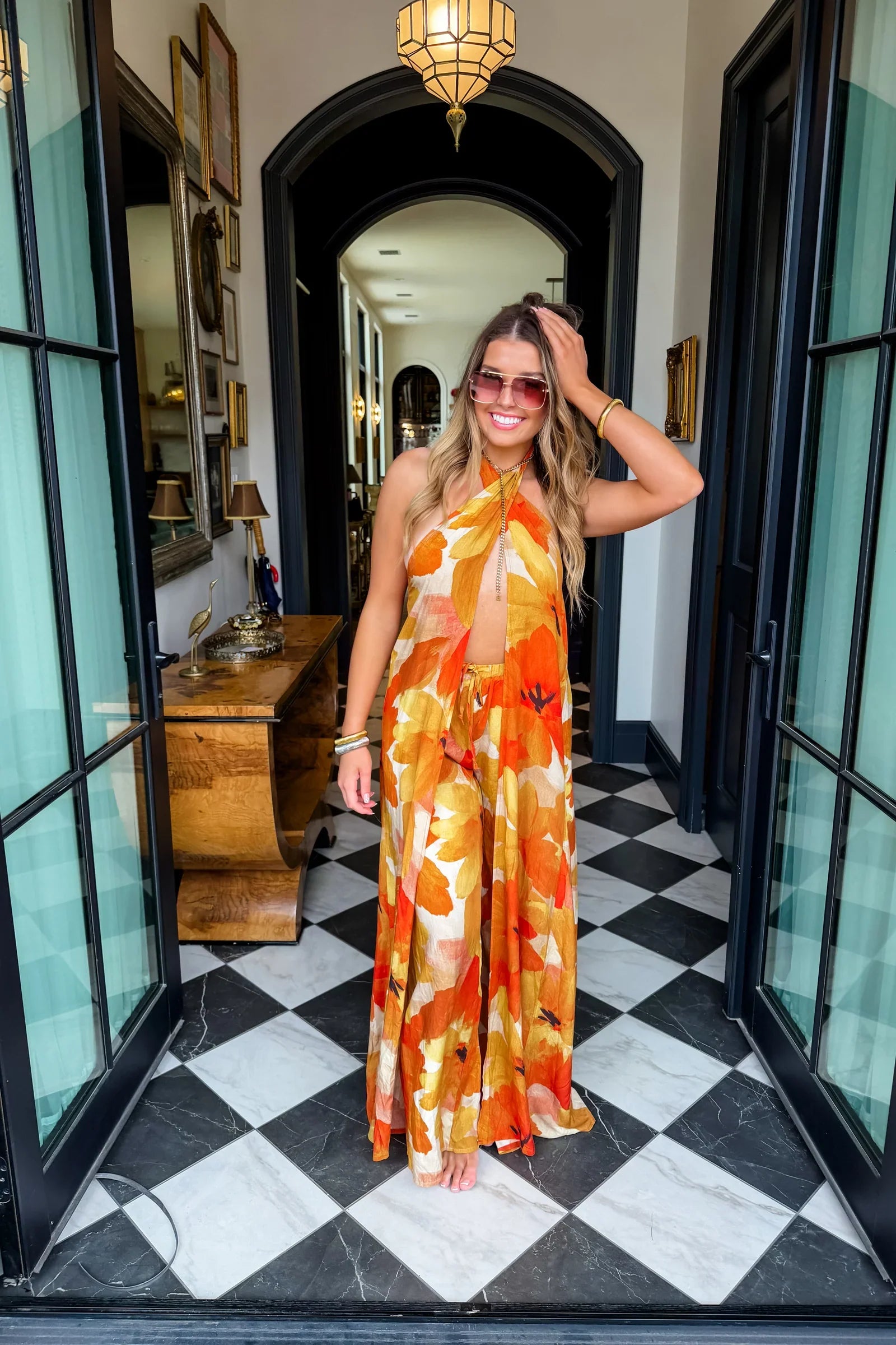 Turn up the heat in this stunning tropical halter two-piece set! Featuring a flowy open-front halter top and wide-leg pants (with elastic waist) with a breezy, relaxed fit, this set captures effortless resort style. The bold orange and yellow floral print radiates sunshine vibes, perfect for beach getaways, summer parties, or vacation strolls.