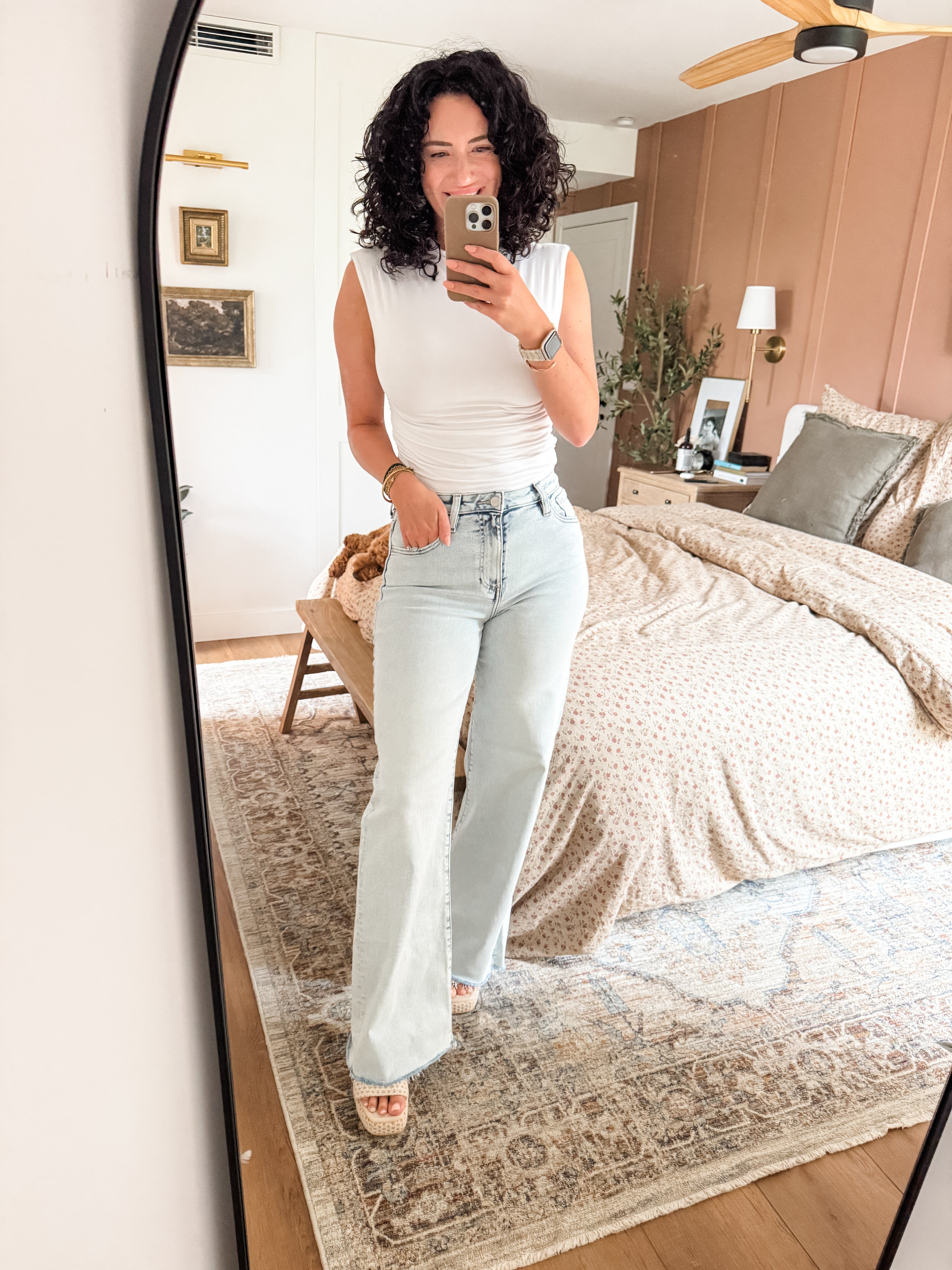 These stunning light wash wide leg jeans feature a high-waisted design that creates a flattering silhouette while offering modern comfort. Crafted from premium stretch denim in a beautiful light blue wash, these jeans showcase classic five-pocket styling with contemporary wide leg cut. The raw hem detailing adds an edgy touch while the comfortable fabric blend ensures all-day wearability. Perfect for creating effortless casual looks or dressing up with heels for a chic ensemble. The high waist design accentuates your natural waistline while the wide leg provides a relaxed, on-trend fit.