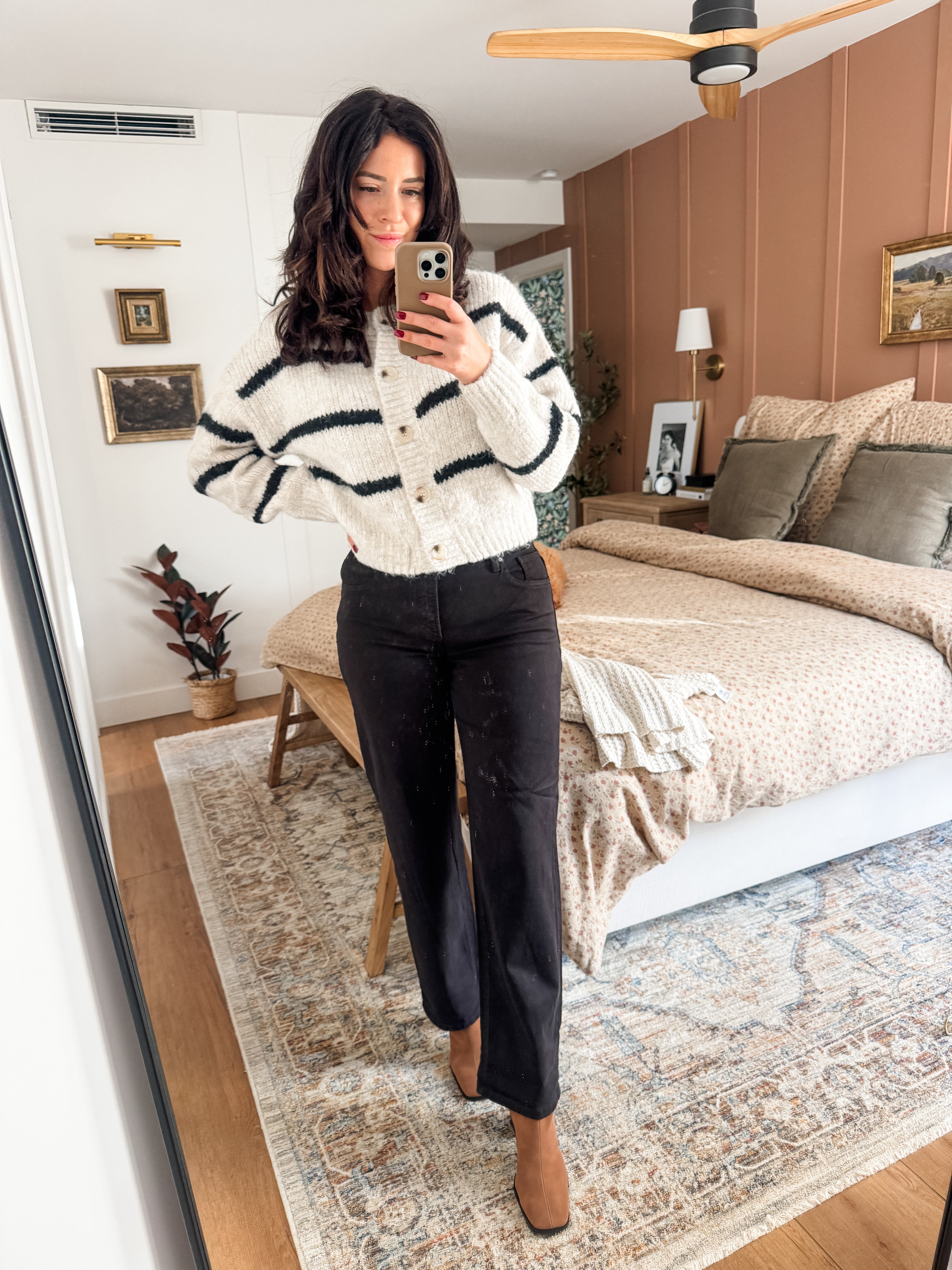 These classic black wide-leg straight jeans feature a comfortable high-waisted design with a relaxed fit that flatters all body types. Crafted from premium cotton denim blend for durability and comfort, these jeans showcase a timeless straight silhouette with a modern cropped length. The classic five-pocket construction and silver button closure provide authentic denim styling, while the versatile black color makes them perfect for both casual and semi-formal occasions. The wide-leg cut offers freedom of movement and creates an effortlessly chic look that pairs beautifully with any top.