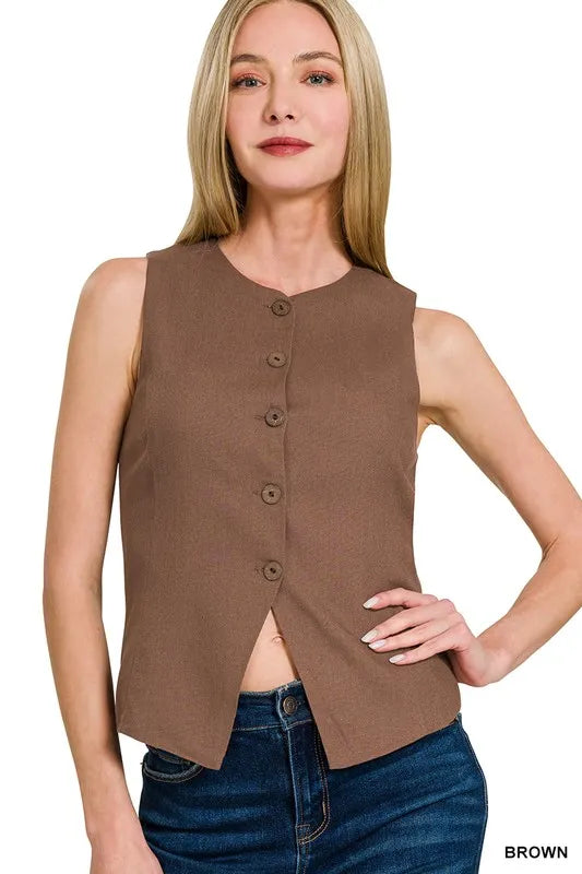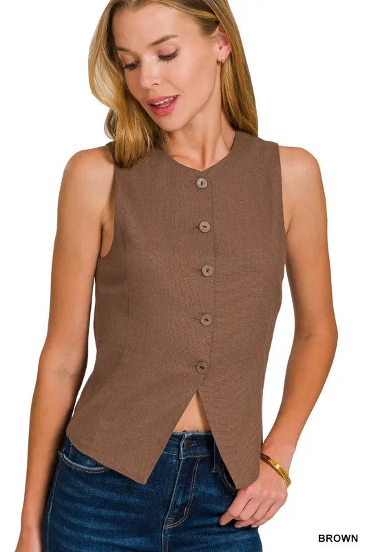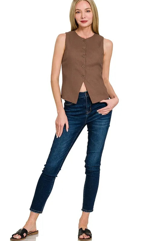 A linen button-down vest is a versatile and stylish piece that can be worn in various ways to elevate your outfit. The linen fabric makes it lightweight and breathable, perfect for warm weather or layering during cooler seasons. The button-down design adds a sophisticated touch, and you can dress it up or down depending on the occasion. Pair it with a blouse and trousers for a chic workwear look, or wear it over a dress or with jeans for a casual yet polished ensemble. The vest can also be worn open or closed, giving you options to style it according to your preference. Overall, a linen button-down vest is a great addition to your wardrobe for adding an extra layer of interest and style to your outfits.