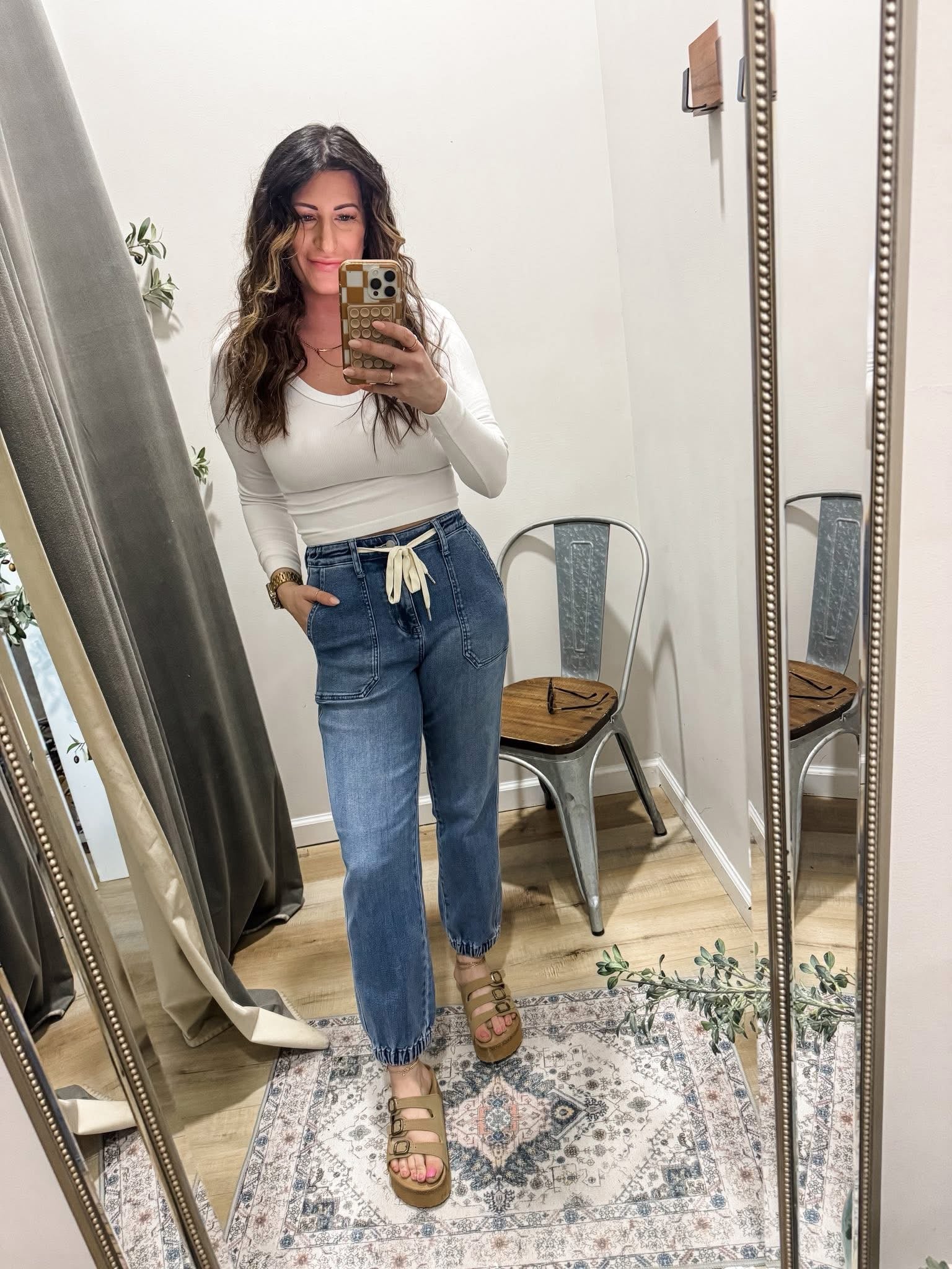 The High Waist Denim Jogger is a modern and stylish fusion of denim jeans and comfortable jogger pants. The high waist design provides a flattering and elongating effect on the waistline, creating a sleek and stylish look. The jogger style adds a casual and relaxed vibe to the denim, making it perfect for both casual and athleisure wear. These pants typically feature a drawstring waist, elasticized cuffs at the ankle, and a loose, comfortable fit through the legs. The denim fabric gives a classic touch to the jogger style, making them a versatile piece that can be dressed up or down depending on the occasion. Pair them with a fitted top and sneakers for a sporty-casual look, or dress them up with heels and a blouse for a more elevated ensemble. The high waist denim joggers offer the perfect balance between comfort and style, making them a trendy and practical addition to your wardrobe.
